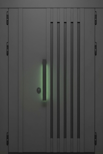 Полуторная стальная дверь с рейками, бугельной ручкой с подсветкой и темно-серыми панелями МДФ RAL 7016 — подойдёт тем, кто ценит качество и выразительный дизайн. МДФ-панели имитируют натуральную древесину, создавая эффект дорогой деревянной поверхности. Поддерживают визуальную симметрию пространства. Дизайн-проект придаёт двери выразительный и современный облик.